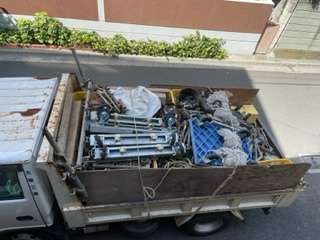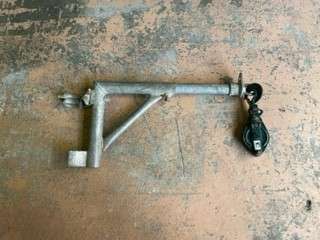 上記写真は金車といって足場最上部に取り付けて滑車の部分にロープを通して下からロープを引っ張り荷揚げをする為の道具です。